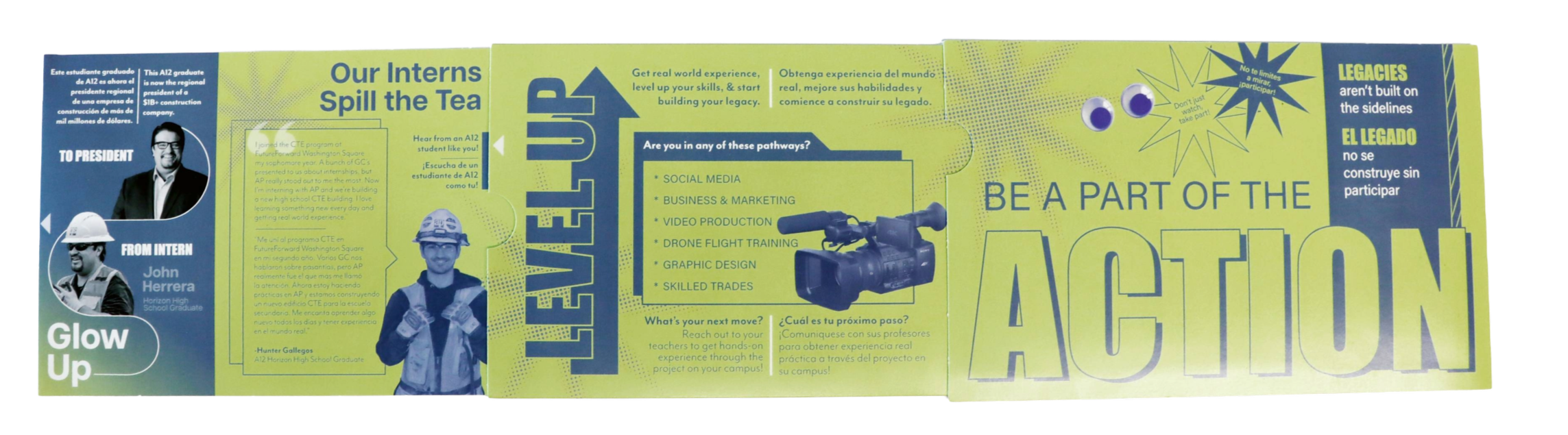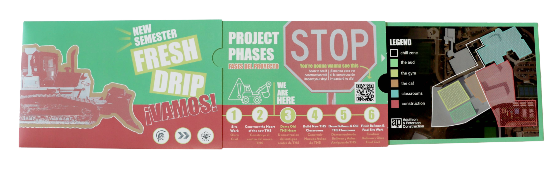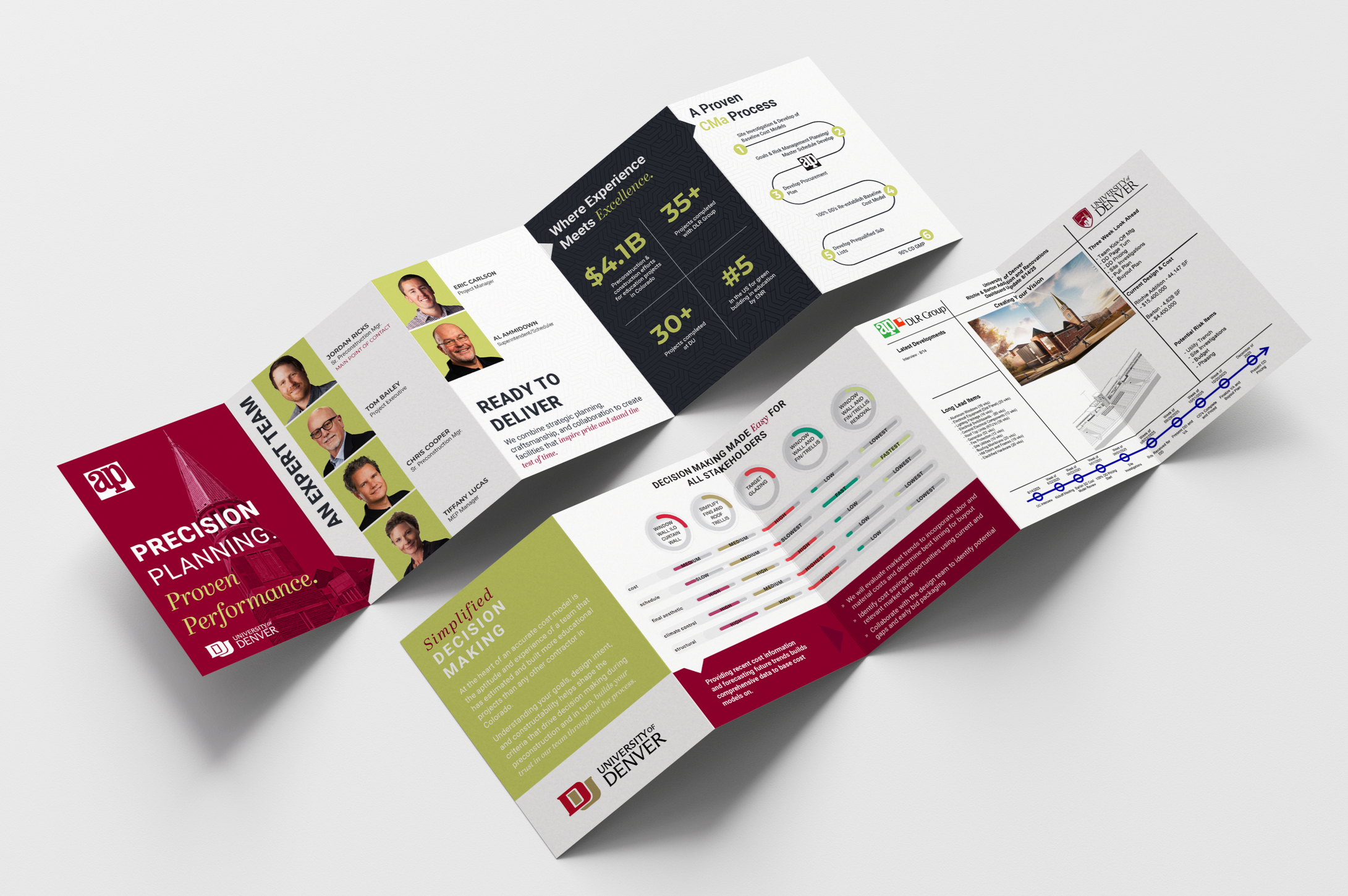 Designed compelling pursuit and proposal materials for Adolfson & Peterson, including custom leave-behinds, editorial layouts, and presentation graphics that elevated storytelling in competitive RFP environments. Notably, I created a kaleidoscope-style pull-out leave-behind for Thornton High School that contributed to securing a $200M RFP win.